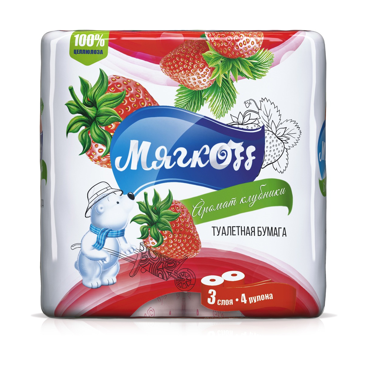 Туалетная бумага «Мягкоff», белая, с ароматом клубники, со втулкой, с перфорацией, с тиснением, 100 % целлюлоза, размер листа 120 х 95 мм, 144 листа, 3 слоя, 17,28 метра в рулоне, 4 рулона в пачке, 12 пачек в упаковке, упаковка: полиэтиленовый мешок.